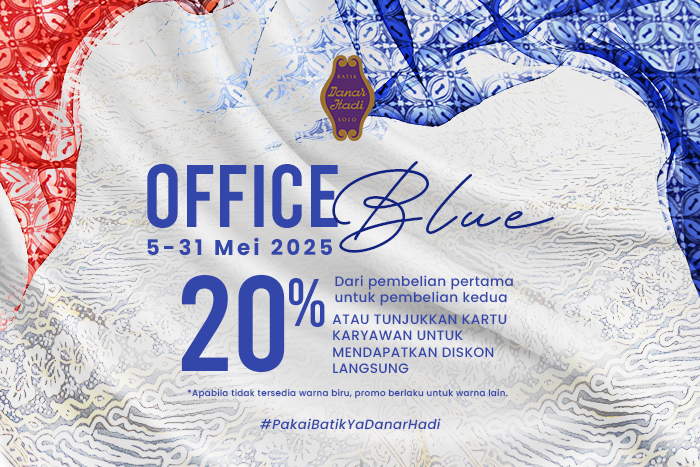 Lengkapi koleksi office looks Batik Danar Hadi Anda pada program special OFFICE BLUE! yang berlangsung pada tanggal 05-31 Mei 2025 dan dapatkan *disc.20% dari pembelian pertama untuk pembelian kedua. Atau tunjukan Kartu Karyawan untuk mendapatkan diskon langsung!